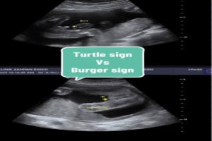 يستطيع الطبيب المساعدة على تحديد نوع الجنين بالبحث عن شكل اعضاء الجنين الذكر والتي تظهر في تصوير السونار بشكل غطاء السلحفاة وتسمى علامة السلحفاة turtle sign كما يتضح في الصورة التالية.